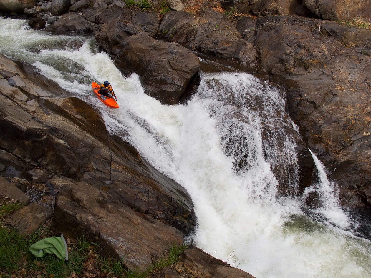 We encountered some really fun drops and made short work of the first gorge. It almost seemed too easy and, this seems to happen frequently, but I started to think about how fast we were going to blast the creek and how it’s always easier than people make it out to be when they try to scare you. We paddled a few more quality drops and then we got to Stairway to Hell. It looked big and steep as I stepped out of my boat, and I could tell it went into a walled in section about two thirds of the way through the rapid. The entrance looked awesome, with a couple of ten footish drops back to back along the right wall. I think that was the stairway, cause all hell broke loose downstream as the water cascaded into a huge boulder on the left shore and bounced back into a stout hole that fed diagonally into a sieved out rock pile on the left. The clean route was through the hole and down the right side of the sieve pile through about ten more feet of gradient that looked at best, “bouncy.”